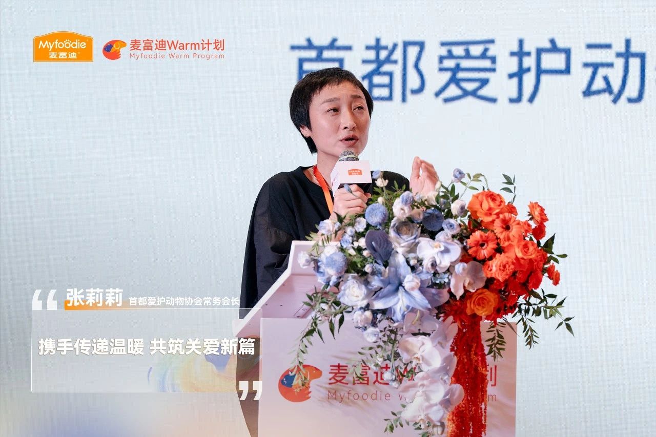 今天,我想用简短的时间,与大家分享首都爱护动物协会与麦富迪这段温暖而富有成效的公益合作历程。 首都爱护动物协会创办至今已有30余年,我们的公益项目扎根首都、覆盖全国,始终致力于改善伴侣动物生存状况、倡导科学文明养宠理念、推动人与动物和谐共生。我们深知,这项事业需要社会各界的广泛参与和支持,尤其需要像麦富迪这样富有爱心和责任感的优秀企业伙伴。