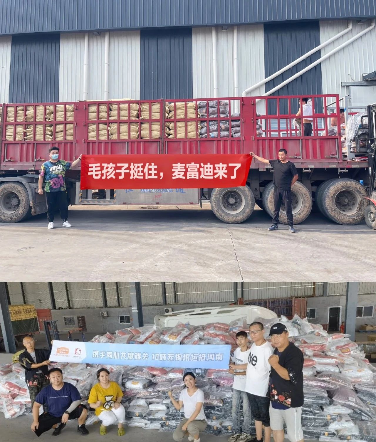 2021年河南特大水灾,当地很多流浪动物救助小院受灾严重,首爱驾驶医疗车连夜出发,奔赴灾区。在确认了灾区急需的物资清单后,我给麦富迪打了一通电话,我记忆很深刻,那通电话仅仅不到1分钟的时间,我说: ”河南水灾我们去,我们的医疗车去,灾区需要很多物资,你们愿不愿意支持? 电话那边没有丝毫的犹豫:“必须支持!我们捐赠宠粮!” 简单的几句对话,是无需多言的默契,10吨宠粮第一时间发往受灾地区,也是经首爱执行发放的全部物资中,最先运抵灾区的物资。
